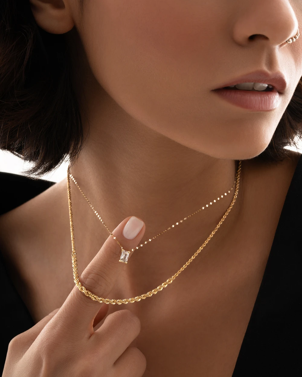 یکی از جذاب‌ترین ویژگی‌های گردنبند باگت، قابلیت ست شدن به‌صورت لایه‌ای است. همان‌طور که در تصویر مشاهده می‌کنید، این گردنبند به‌زیبایی در کنار زنجیرهای مینیمال دیگر، مانند گردنبند باگت، قابل استفاده است و ترکیبی مدرن و ترند را ایجاد می‌کند.