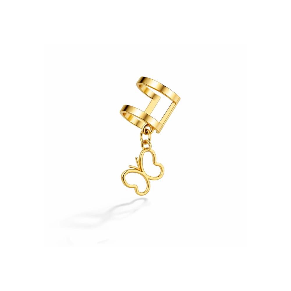 طراحی این مدل با یک آویز ظریف پروانهای تکمیل شده که نمادی از لطافت، آزادی و زیبایی طبیعی است. اندازه تقریبی پروانه حدود ۷ میلیمتر بوده و بهگونهای طراحی شده که در عین ظرافت، جلوهای کاملاً قابلمشاهده روی گوش ایجاد کند. ساخت این ایرکاف از طلای ۱۸ عیار انجام شده که علاوه بر درخشندگی بالا، دوام و ارزش مادی مناسبی نیز دارد.