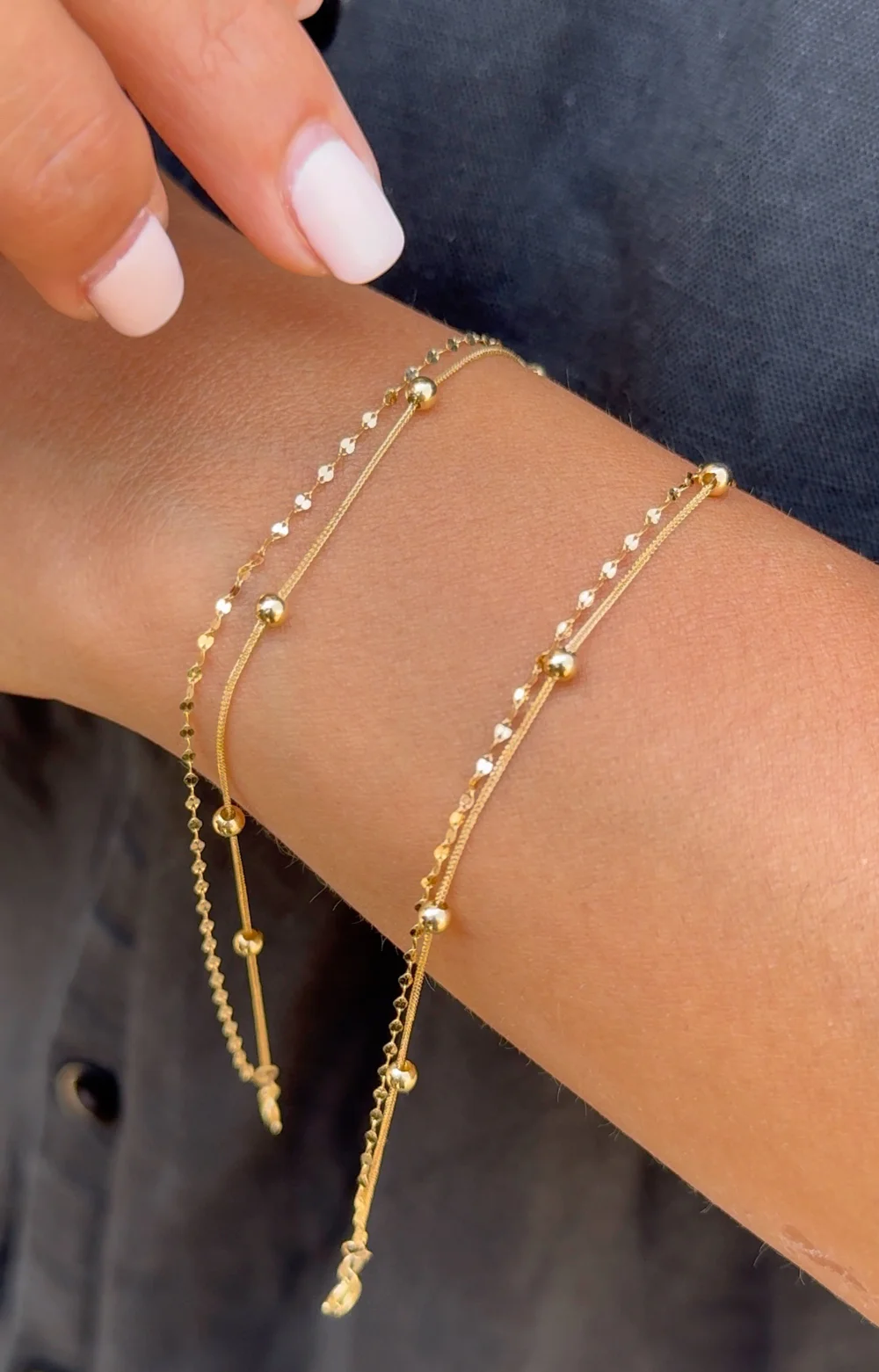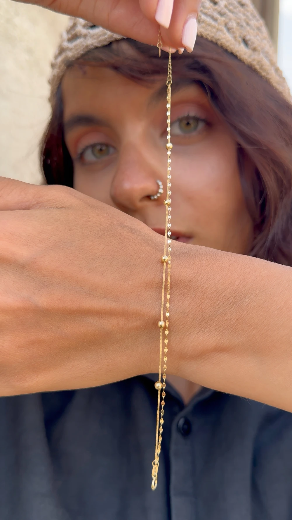 این دستبند با طراحی منحصربهفرد خود ترکیبی از دو نوع زنجیر است. یکی از رشتههای این دستبند از نوع زنجیر استار پولکی است که با انعکاس نور جلوهای درخشان و متفاوت به دستبند میبخشد، و رشته دیگر آن زنجیر میروه است که در میان آن پنج عدد گوی طلای ظریف قرار گرفته و زیبایی کار را دوچندان کرده است.