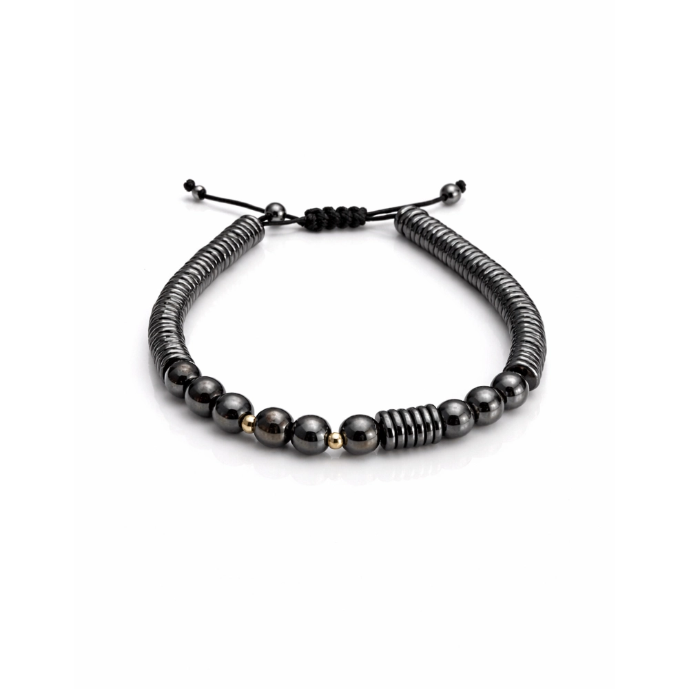 در طراحی این مدل، دو گوی طلای ۱۸ عیار در کنار مهرههای سنگ حدید دودیرنگ قرار گرفتهاند؛ ترکیبی که حس استحکام، تمرکز و مردانگی را منتقل میکند.