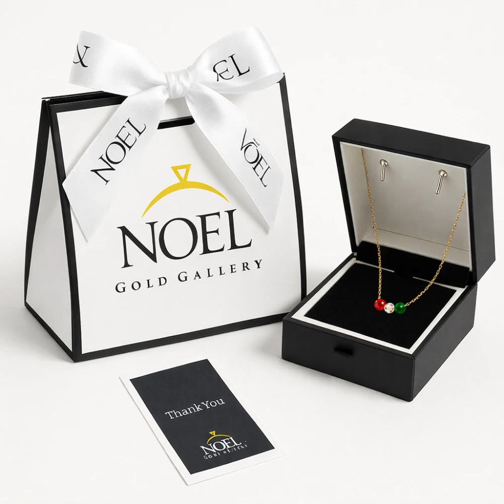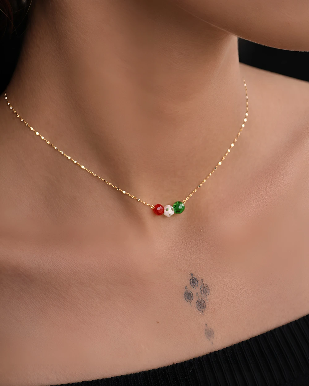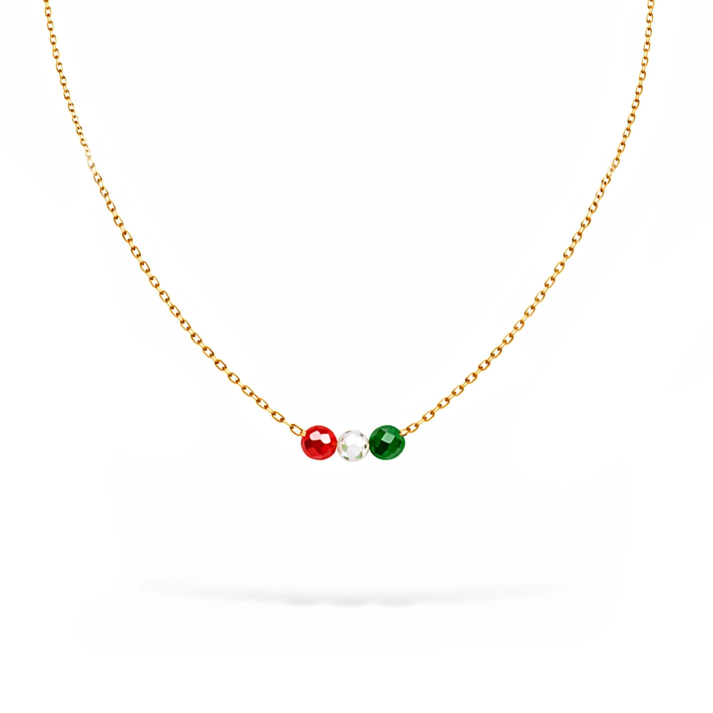 استفاده از سه مهره‌ی سنگ‌تراش با رنگ‌های قرمز، سفید و سبز در کنار زنجیر طلای ظریف، جلوه‌ای چشم‌نواز و در عین حال معنادار ایجاد کرده که این گردنبند را به انتخابی متفاوت برای علاقه‌مندان به زیورآلات مفهومی تبدیل می‌کند.طلای به‌کاررفته در این محصول از نوع طلای ۱۸ عیار است. طول زنجیر این گردنبند ۴۰ سانتی‌متر طراحی شده است.همچنین مهره‌های استفاده‌شده از سنگ‌های تراش‌خورده باکیفیت انتخاب شده‌اند که انعکاس نور در آن‌ها، جلوه‌ای لوکس و درخشان به گردنبند می‌بخشد.