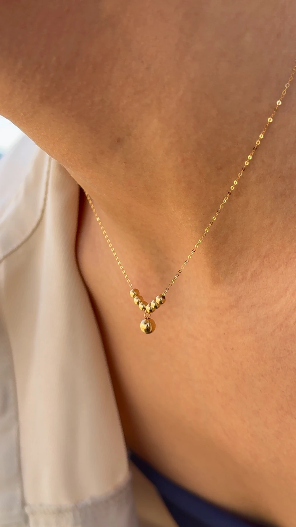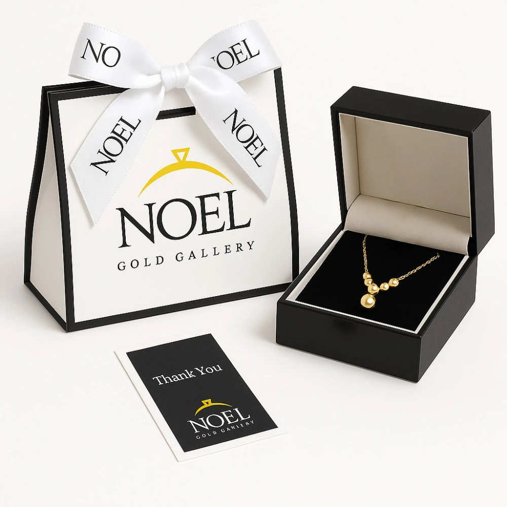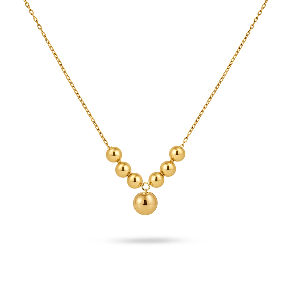 در مرکز گردنبند، شش گوی طلایی ظریف بهصورت هماهنگ در کنار هم قرار گرفتهاند و یک گوی طلایی بزرگتر بهصورت آویز در بخش میانی، زیبایی و حرکت خاصی به طراحی بخشیده است. این ترکیب باعث میشود گردنبند در عین سادگی، جلوهای لوکس و چشمگیر داشته باشد. زنجیر این گردنبند نیز از نوع حلقهدار سایزدار است که امکان تغییر اندازه بین ۳۸ تا ۴۱ سانتیمتر را فراهم میکند و به راحتی روی گردنهای مختلف قرار میگیرد.