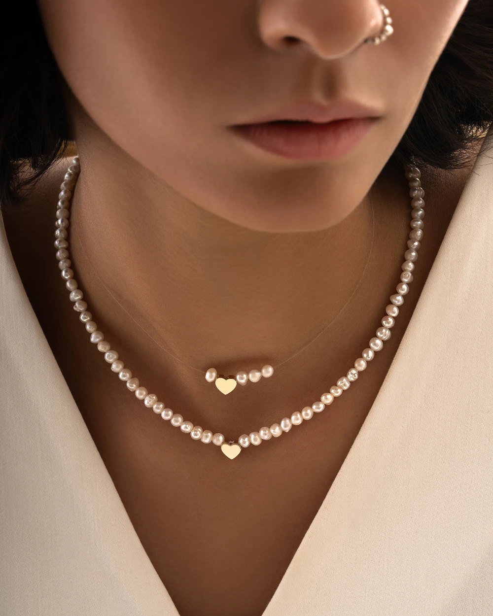 در نهایت، میتوانید این گردنبند قلب مرواریدی را همانطور که در تصویر مشاهده میکنید، بههمراه گردنبند قلب با مروارید و بند نامرئی ست کنید تا یک ترکیب لایهای، ظریف و بسیار جذاب ایجاد شود. این استایل لایهای، جلوه گردنبند را چند برابر کرده و انتخابی مدرن و چشمگیر برای تکمیل استایل روزانه یا مناسبتی شما خواهد بود