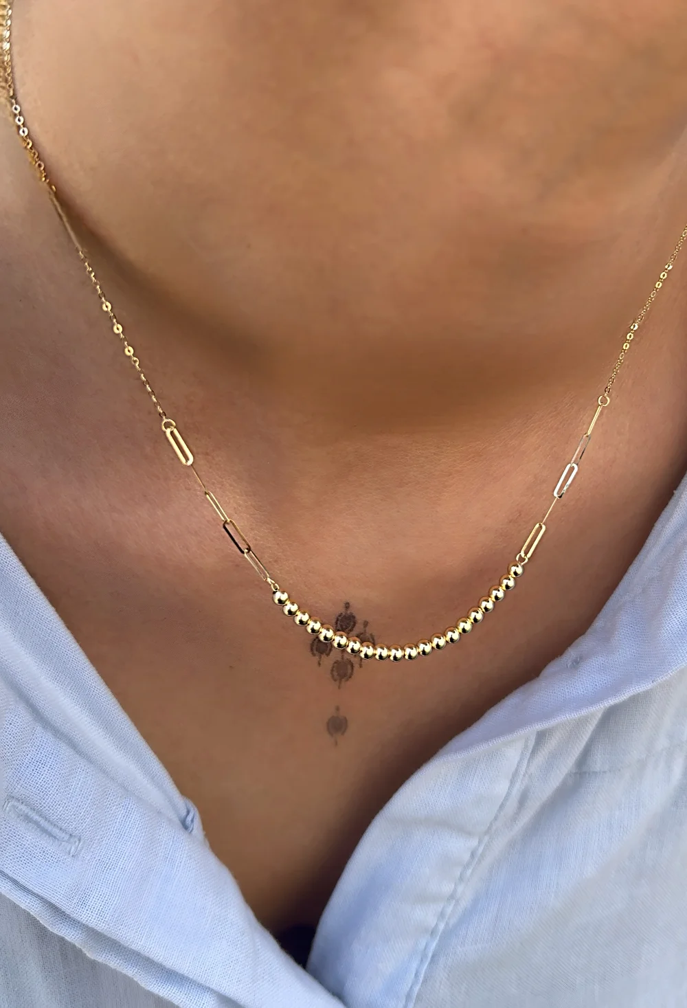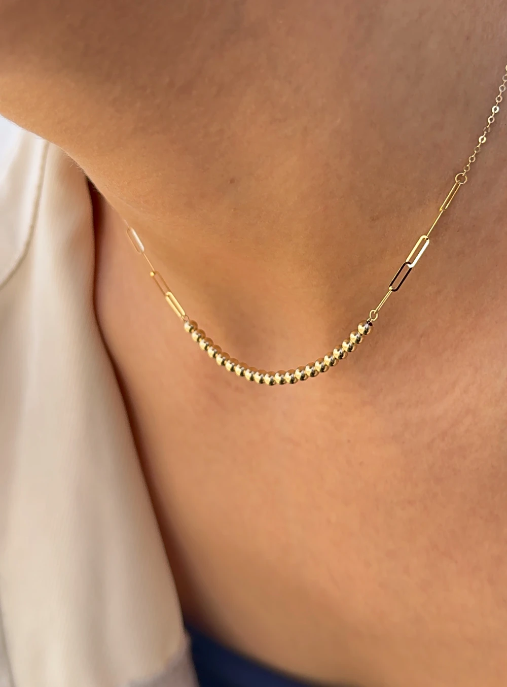 این گردنبند از چند بخش اصلی تشکیل شده است. قسمت مرکزی آن از ردیفی از گویهای طلایی ساخته شده که جلوهای درخشان و هماهنگ ایجاد میکنند. در دو طرف گویها، زنجیر هرمس قرار دارد که به دلیل بافت خاص و پیوندهای منظمش، هم استحکام بالایی به گردنبند بخشیده و هم زیبایی آن را دوچندان کرده است. در ادامه، طراحی با زنجیر فلامینگو تکمیل میشود که با حالت ظریف و روان خود، تعادل و لطافت بیشتری به کل ترکیب میبخشد.