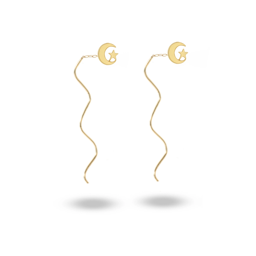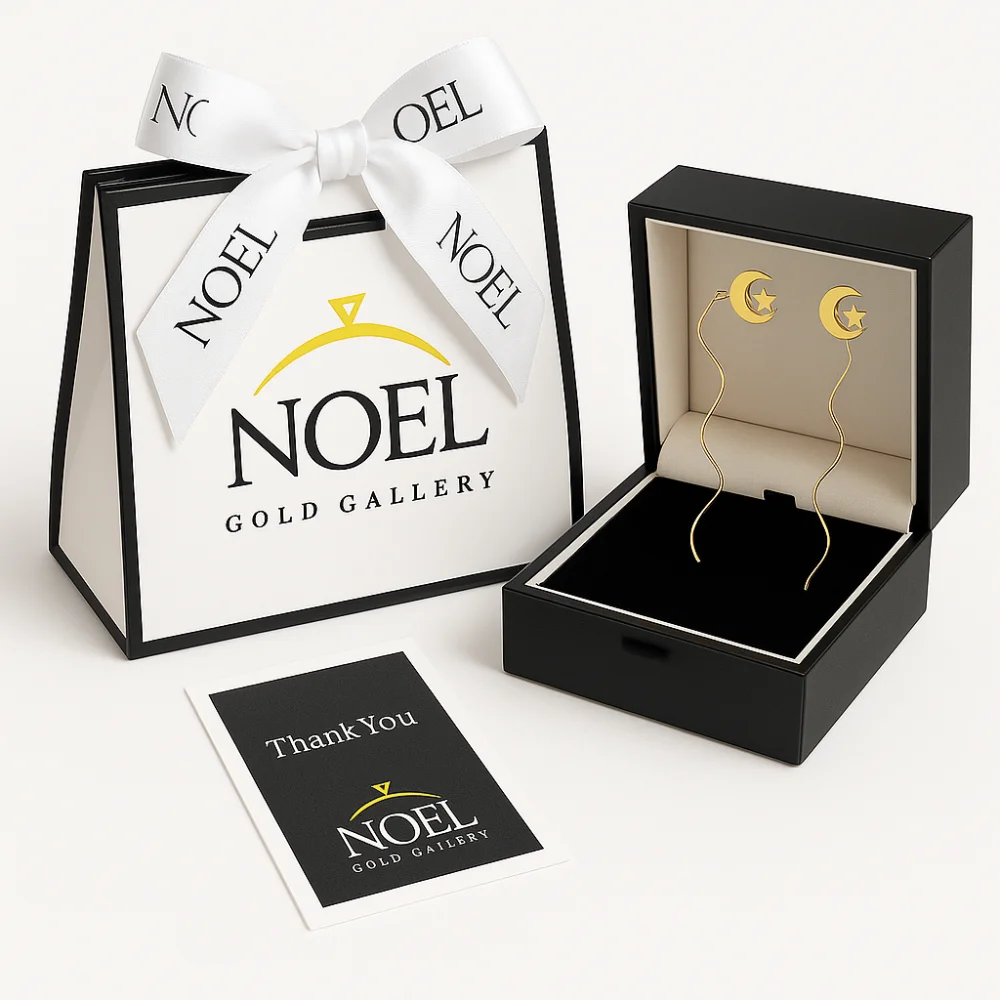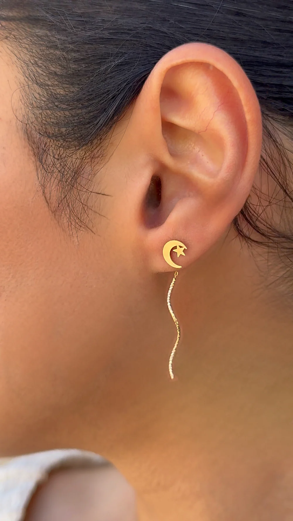 در پشت پلاک ماه و ستاره، یک زنجیر به طول یک سانتیمتر طراحی شده است. این زنجیر به مفتول فنری باریک متصل میشود که به راحتی از سوراخ گوش عبور میکند. همین جزئیات باعث میشود گوشواره بدون نیاز به پشتگوشواره روی گوش ثابت بماند و فرم درستی به خود بگیرد. طول کلی گوشواره (از پلاک تا انتهای مفتول فنری) حدود ۵ سانتیمتر است که باعث میشود در هنگام حرکت سر، جلوهای شناور و رقصان داشته باشد. این حالت متحرک و روان یکی از مهمترین ویژگیهای این مدل محسوب میشود و جذابیت آن را دوچندان میکند.